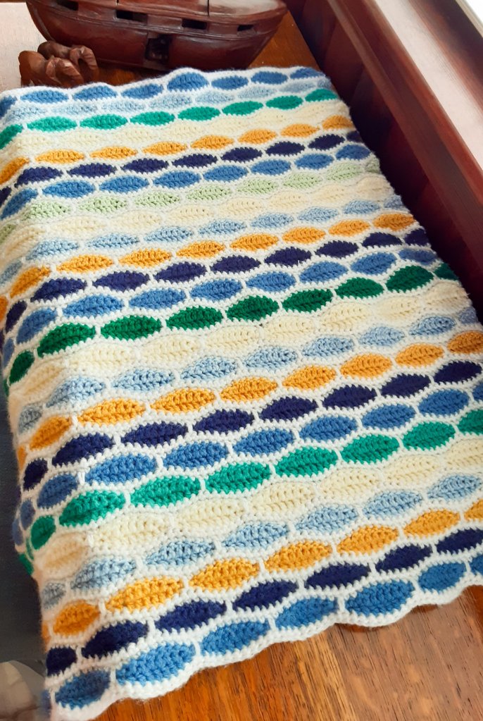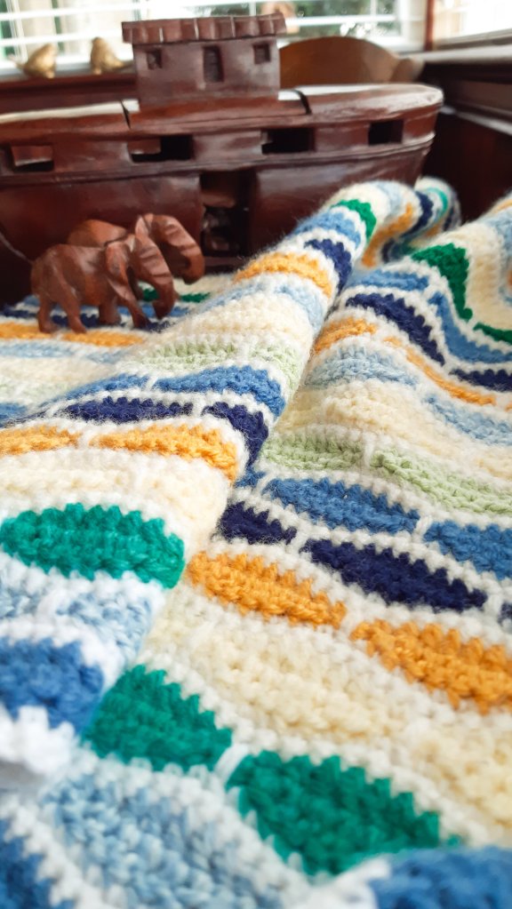 Anyway, baby blanket no.4 was a pattern I had pinned on Pinterest years before, it’s so pretty but simpler than it looks. It’s called the Millstone stitch and there’s a YouTube video tutorial on Potter and Bloom’s channel. The written instructions are on their blog here. This blanket has such gorgeous colours and everything was already in my stash. I ran out of the cream yarn near the end and used white instead. It’s slightly noticeable but I didn’t see the point in getting more. So many old quilts and blankets are similar and it’s lovely seeing the story woven in the fabric!