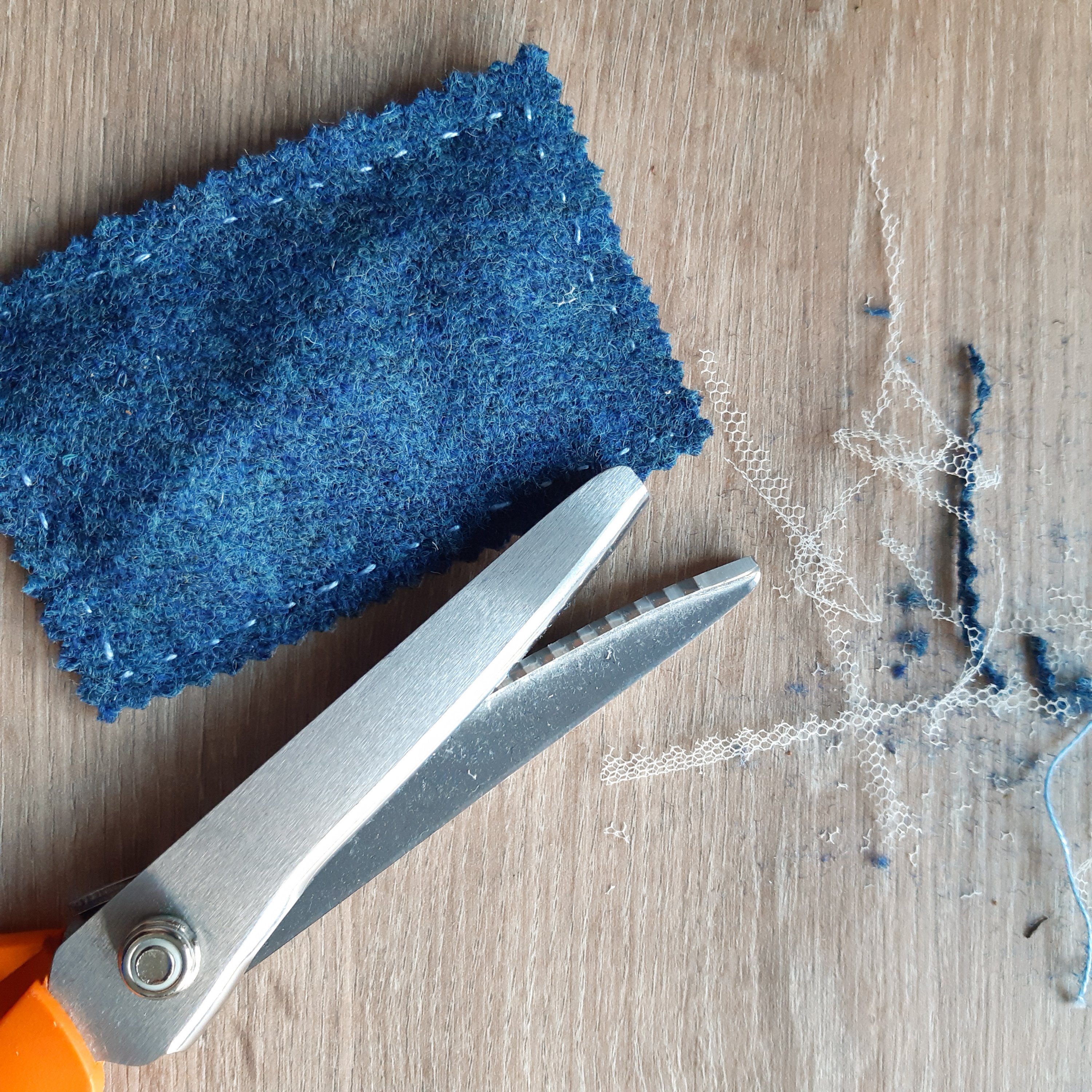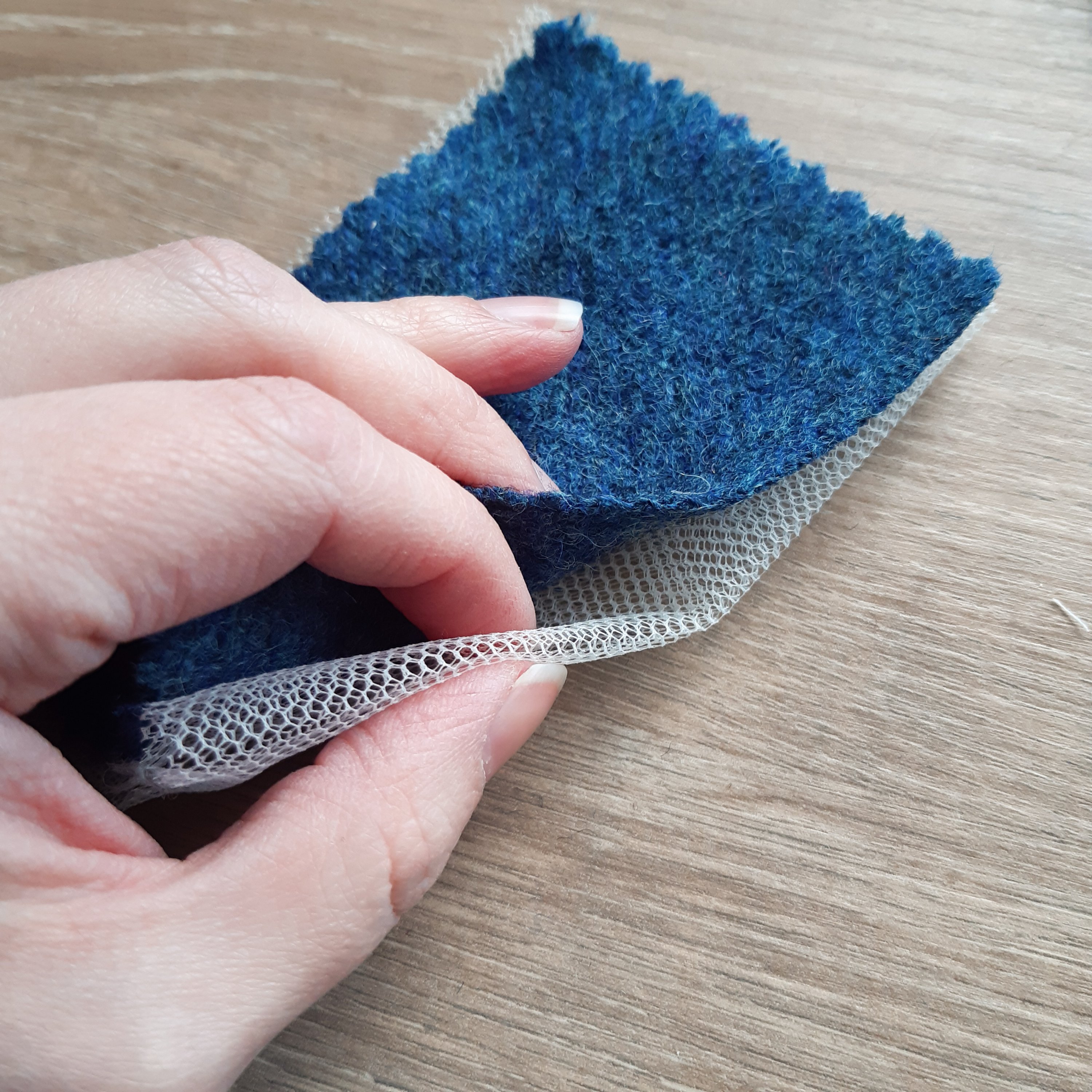 1. Cut out 2 rectangles that are 2″ x 3″ (5cm x 7cm). I used scrap Harris Tweed and some dressmaking mesh stuff I had leftover. Scrapbusting is one of my goals for 2020! For the mesh I wanted four layers so I cut two 4″ x 3″ (10cm x 7cm) rectangles.