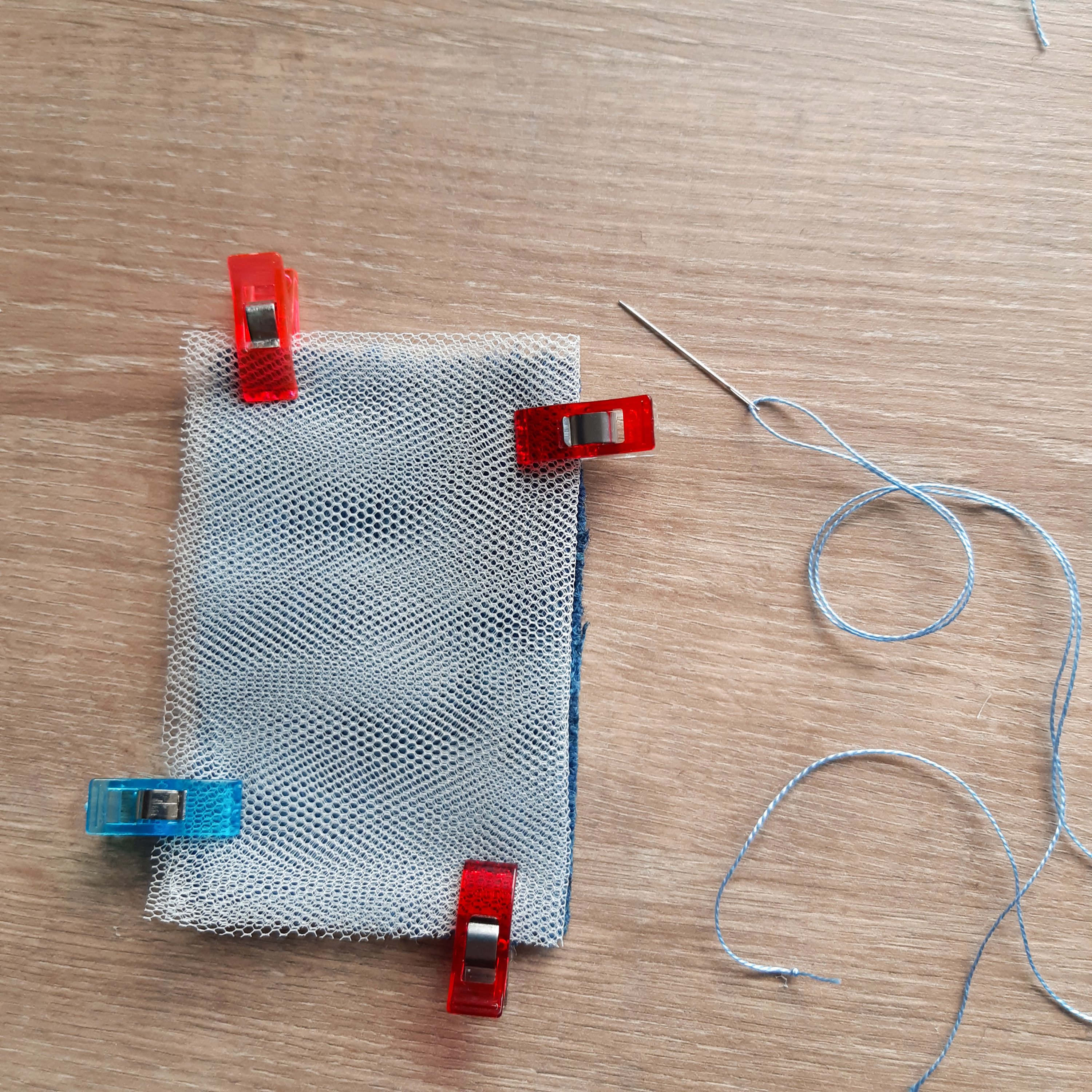 3. Cut a 30 – 40cm length of embroidery thread and knot one end. Pin or clip the fabric pieces together.