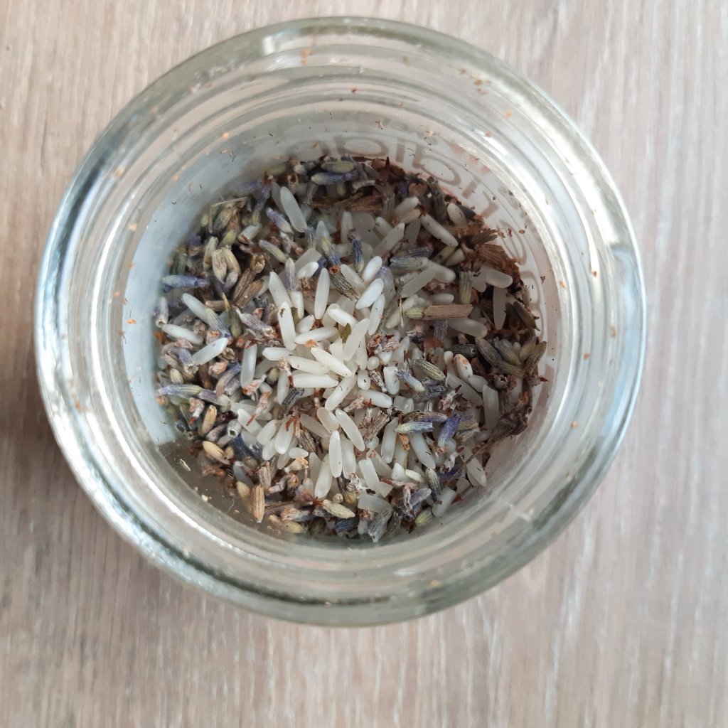 7. To make the filling, gather some rice, dried lavender and lavender essential oil. You can use the dried lavender by itself if you’d like too.