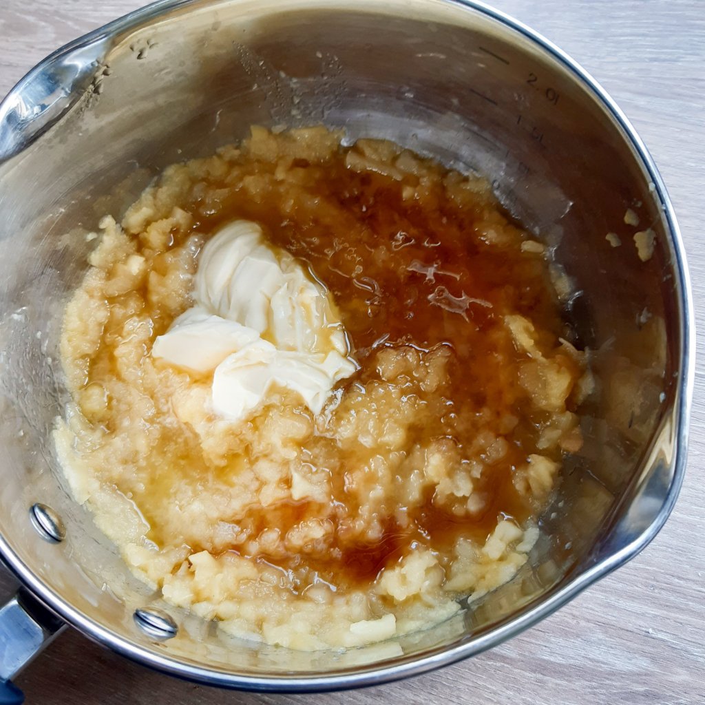 3. Mash the apples when soft and cooked through. Add the butter, honey and vanilla and heat through gently until just melted.